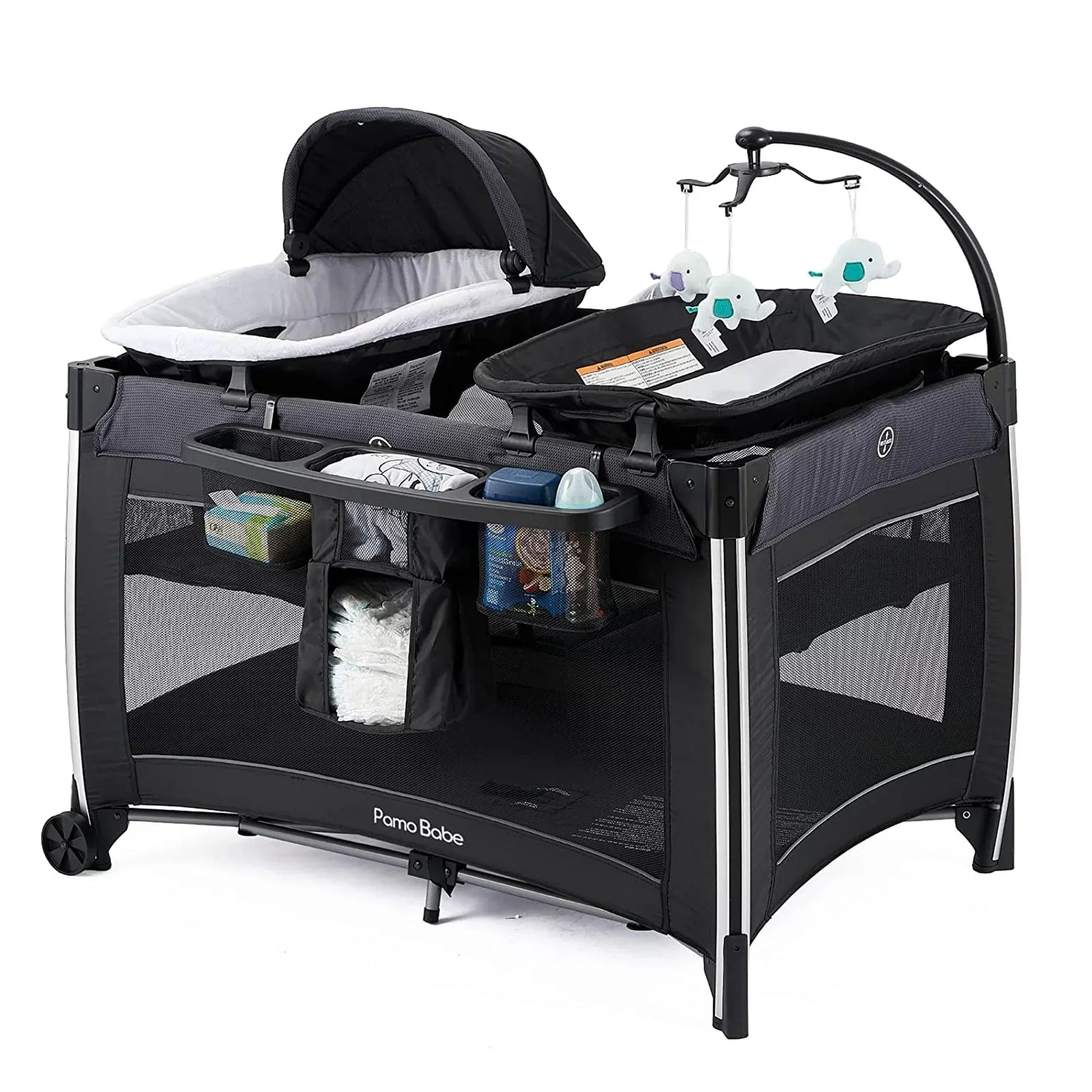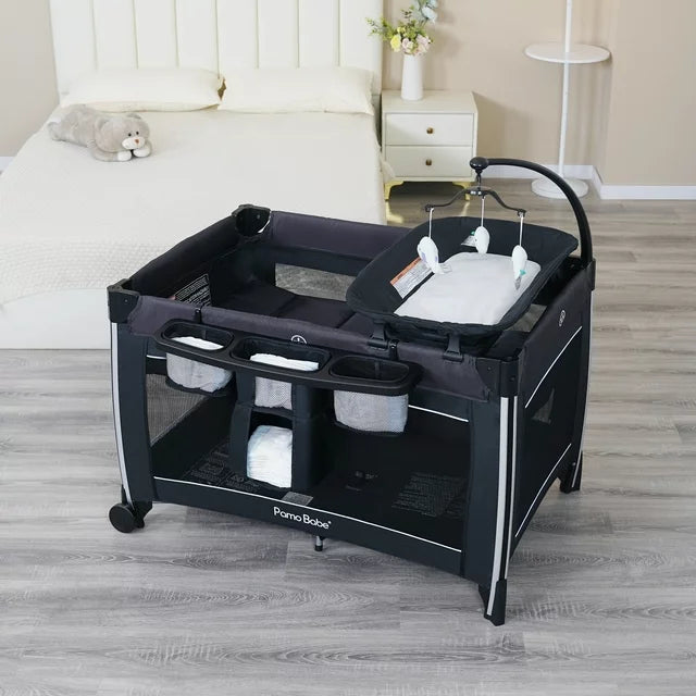 Pamo Babe is a professional manufacturing enterprise specializing in baby product design, research, and development. Our approach to caregiving systems is from a heritage of innovation designed around safety, durability, and the best intentions of loving parents. The Pamo Babe playard will provide you convenient and pragmatic place for the baby to play. The playard includes a removable full bassinet, sleep nest, and changing table. The easy locking mechanism makes the playard stable and it can be moved from place to place with large wheels and secured with brakes. Also included is a convenient travel tote bag. The playard with an incline less than or equal to 7° from horizontal while in use.