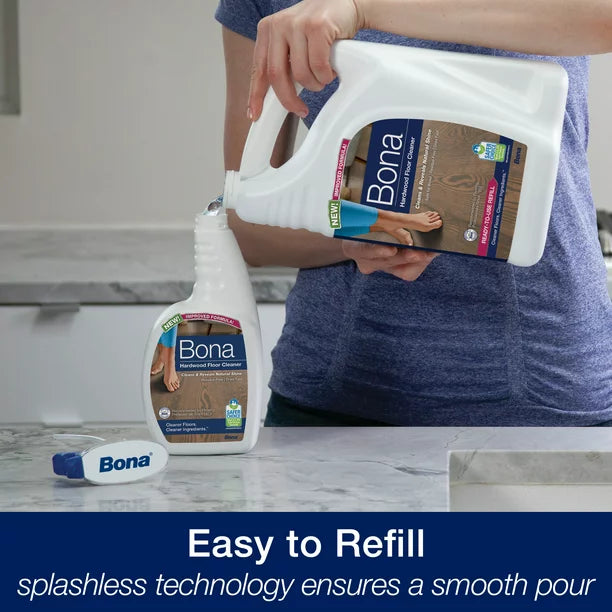 This 96 fl oz Bona Hardwood Floor Cleaner Refill fill your empty Bona spray mop cartridge or spray bottle with ready-to-use Bona Hardwood Floor Cleaner. The bottle has splash-free technology while the wide handle allows for an easy, controllable refill experience. The residue-free, fast drying solution cleans wood floors by gently and effectively removing dust, dirt and grime to reveal the floor’s natural shine and beauty. We believe in crafting our floor cleaners with plant-derived ingredients, and always using water based and biodegradable solutions making a safer product for people, pets, and the planet.
