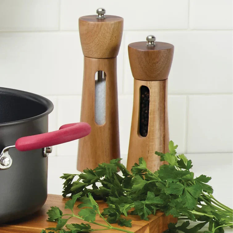 Pass the salt and pepper in style with this eye-catching Rachael Ray Tools and Gadgets 2-Piece Acacia Salt and Pepper Grinder Set. Featuring a 6-1/2-inch medium salt grinder and a 7-1/2-inch large pepper grinder, this sturdy set is perfect for use at the stove or tabletop to add extra flavor to breakfast, lunch, and dinner. Crafted from eco-friendly acacia wood, the salt and pepper grinders are designed with stainless steel bottom plates and ceramic grinders for durability that will last meal after meal. This beautifully-finished grinder set looks great near the stovetop to help spice up dishes while cooking, and also makes a nice gift for someone special. Along with other Rachael Ray Tools and Gadgets, this salt and pepper grinder set complements many great items in Rachael’s collections. Get fresh with perfectly ground salt and pepper while cooking or eating with the stylish Rachael Ray Tools and Gadgets 2-Piece Acacia Salt and Pepper Grinder Set.