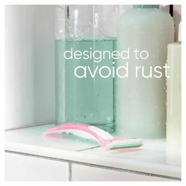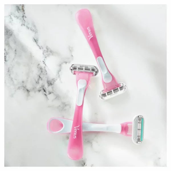 Venus female razor blades are designed with a woman’s body in mind. The Venus Sensitive women’s disposable razors are made for women with sensitive skin. Close and clean in 1 stroke. These female razors have 3 blades for a smooth shave, shaving hair quickly and effectively. This razor’s 3 blades and Skin Elixir lubrastrip with Aloe for glide, deliver a close shave with ease and comfort. The ergonomic pink and white handle is designed with a soft-grip gel to comfortably fit your hands and the pivoting, rounded head hugs curves and fits easily into hard to shave areas. The Skin Elixir lubrastrip activates when wet, providing your sensitive skin with a perfect dose of protection from nicks, cuts and irritation while shaving. Feel up to 0% irritation*. These razors last for up to one month (based on a twice-a-week shave); just use and replace when you’re ready for a new one. No refills needed. The Venus Sensitive Disposable razors for women are Dermatologist tested for sensitive skin. For best results, use with your favorite shave gel or cream. *US Consumer Study, Feb. 2018.